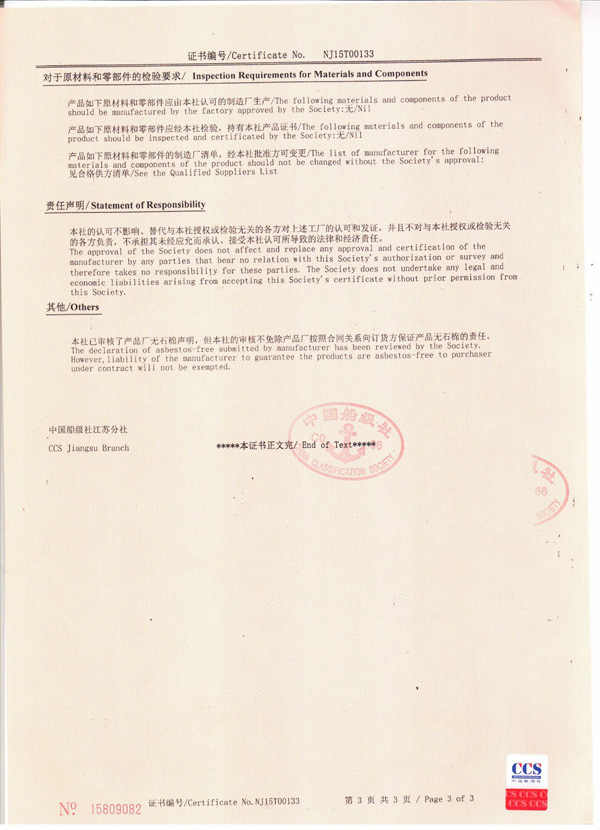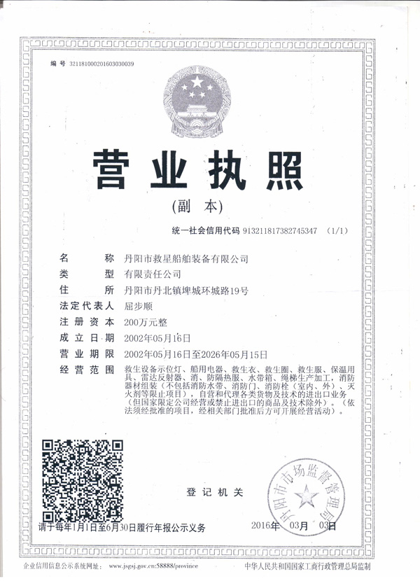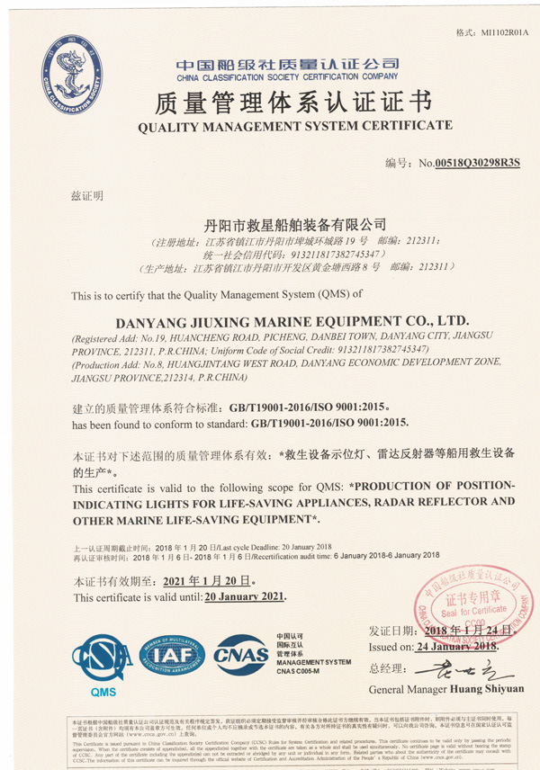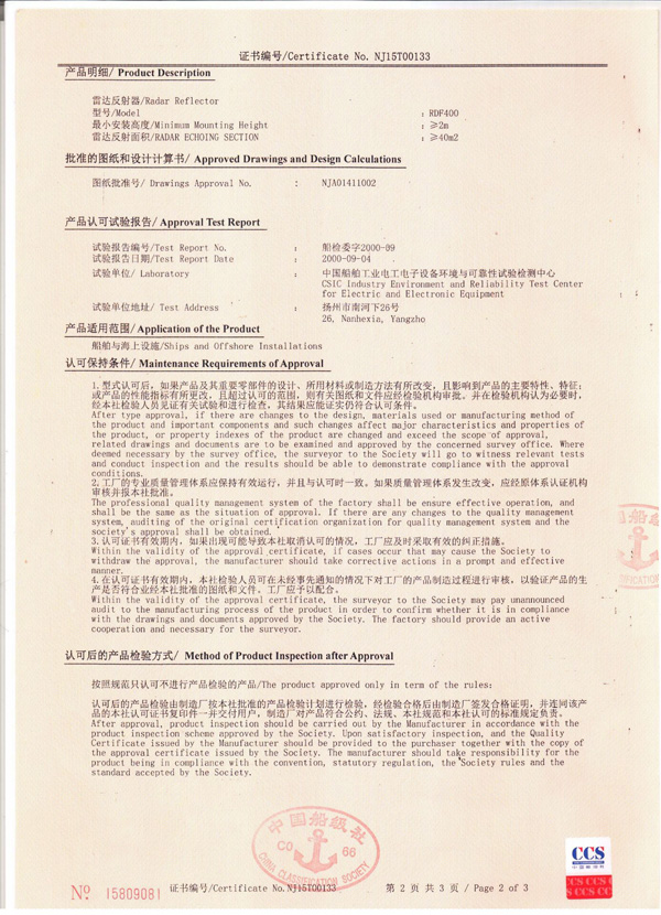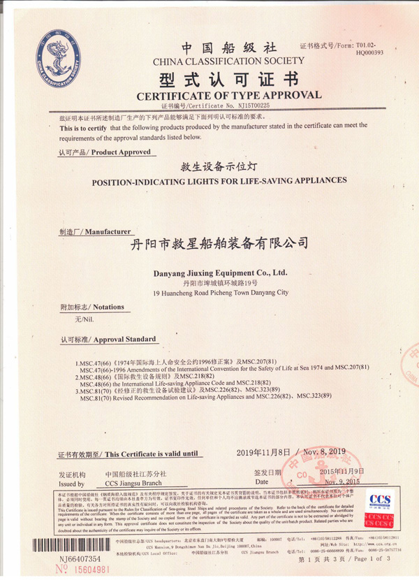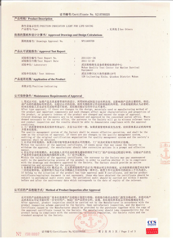 丹陽市救星船舶裝備有限公司為丹陽市船舶救生照明設(shè)備廠子公司,主要生產(chǎn)救生設(shè)備示位燈、雷達(dá)反射器、引航員軟梯、登乘梯等產(chǎn)品。其中救生設(shè)備示位燈采用國(guó)際上最先進(jìn)的科學(xué)技術(shù)、生產(chǎn)工藝,優(yōu)質(zhì)材料制造,各項(xiàng)技術(shù)指標(biāo)超過國(guó)際先進(jìn)水平,完全滿足國(guó)際最新標(biāo)準(zhǔn)。2012年元月取得“CCS”型式認(rèn)可證書,并具有歐共體“EC”證書。另外本公司制造的RDF400雷達(dá)反射器還獲得了實(shí)用新型專利。